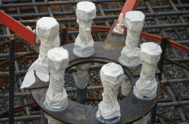 Подготовка к эксплуатации. После затвердевания бетона формируется блок анкерных болтов. Крепежи объединяются посредством металлической или деревянной обноски.